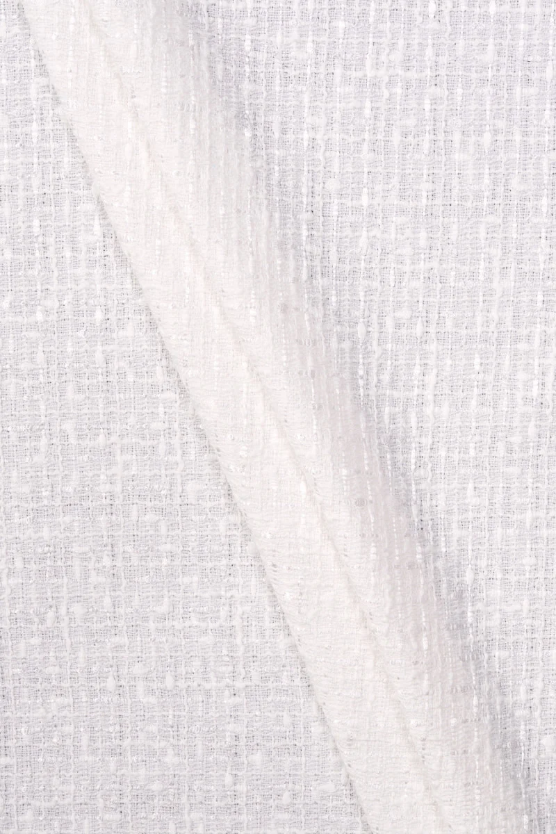 Italiaanse chanel kostuumstof in crèmekleur met een crèmekleurig, delicaat glanzend lint erin geweven.