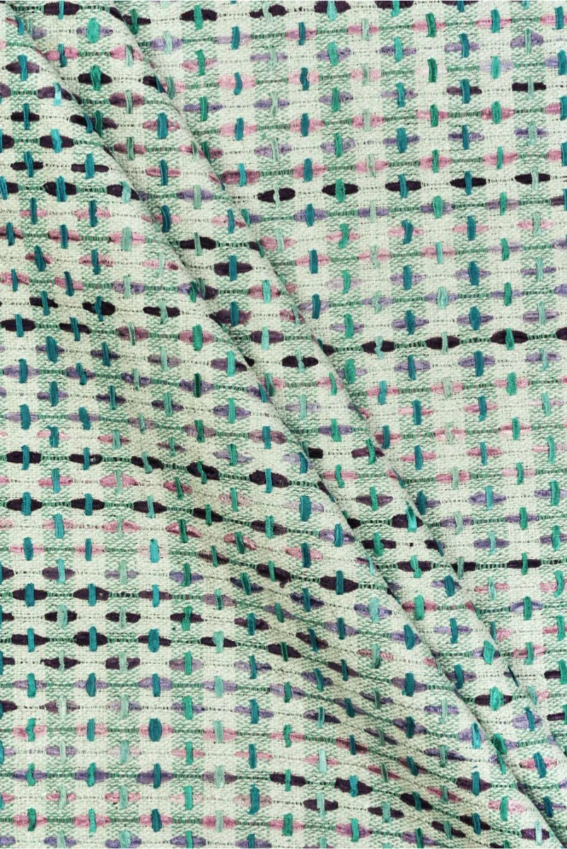 Italiaanse chanel kostuumstof met een dicht weefsel gemaakt van ecru en muntdraad. Het is versierd met kleine patronen die lijken op kruisen, die zijn gemaakt van geweven satijnen linten in de volgende kleuren: mint, turkoois, roze en paars. De patronen creëren verticale strepen die het figuur mooi verlengen en slanker maken. Een zilveren, glanzende draad is subtiel in het materiaal geweven, wat het elegantie geeft. De stof is niet-elastisch, medium-dik en aangenaam zacht. Dankzij het hoge gehalte aan natuurlijke vezels zoals viscose en katoen ligt het materiaal prettig in de grip, wat zich ook vertaalt in draagcomfort. Een geweldige propositie voor mensen die op zoek zijn naar een interessant ontwerp in stoffen. Het kan worden gebruikt om kostuums, jassen, rokken of jurken te naaien.