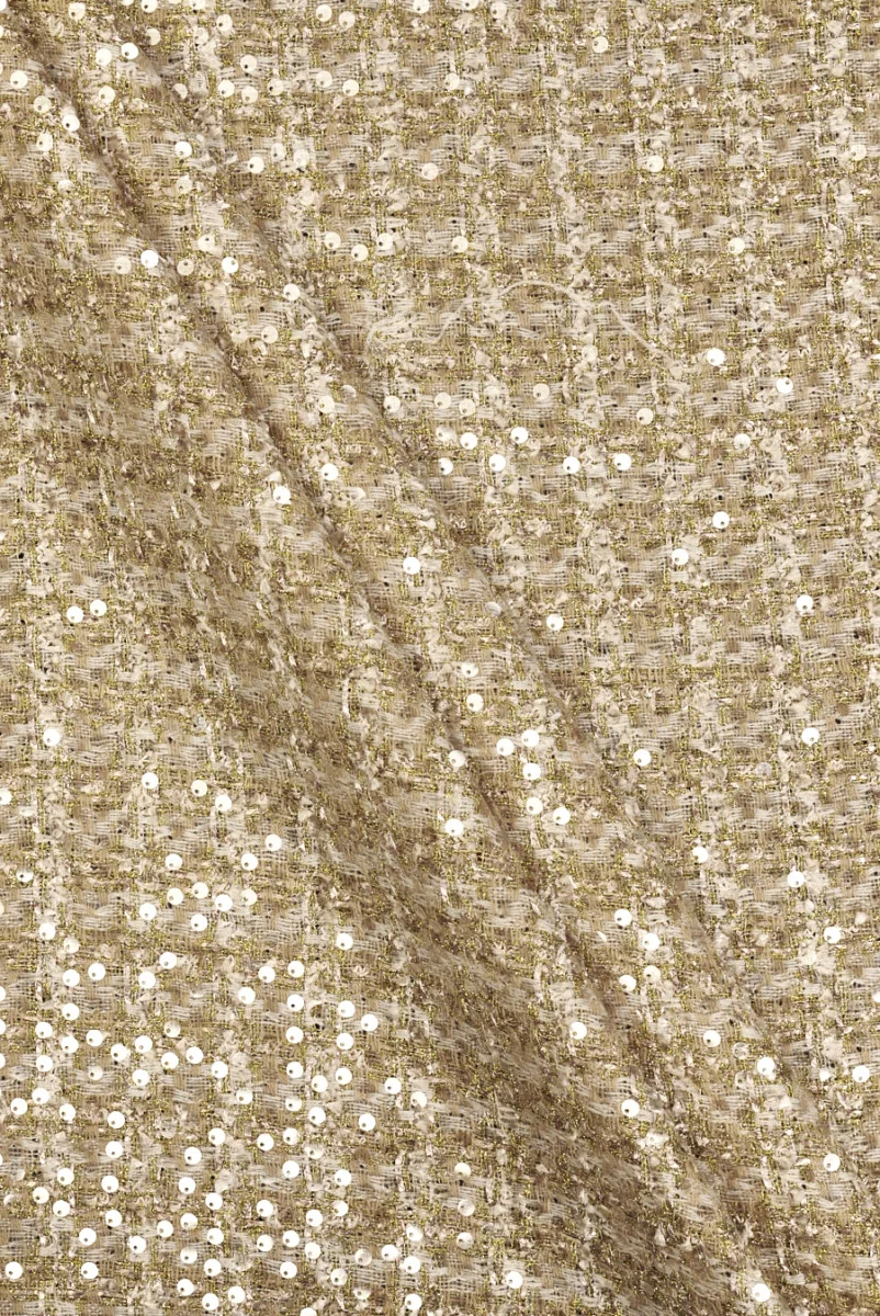 Italiaanse chanel kostuumstof in goud geweven in een klein ruitpatroon. Het geheel is rijkelijk versierd met transparante pailletten die het lichte en glanzende gouddraad prachtig weerspiegelen. Het materiaal is zacht, inelastisch, vrij dun met een los weefsel, kenmerkend voor deze soort, en een waarneembare structuur van draden die iets uitsteken. Een zeer elegante stof waaruit je jurken, rokken, jassen en kostuums kunt naaien.