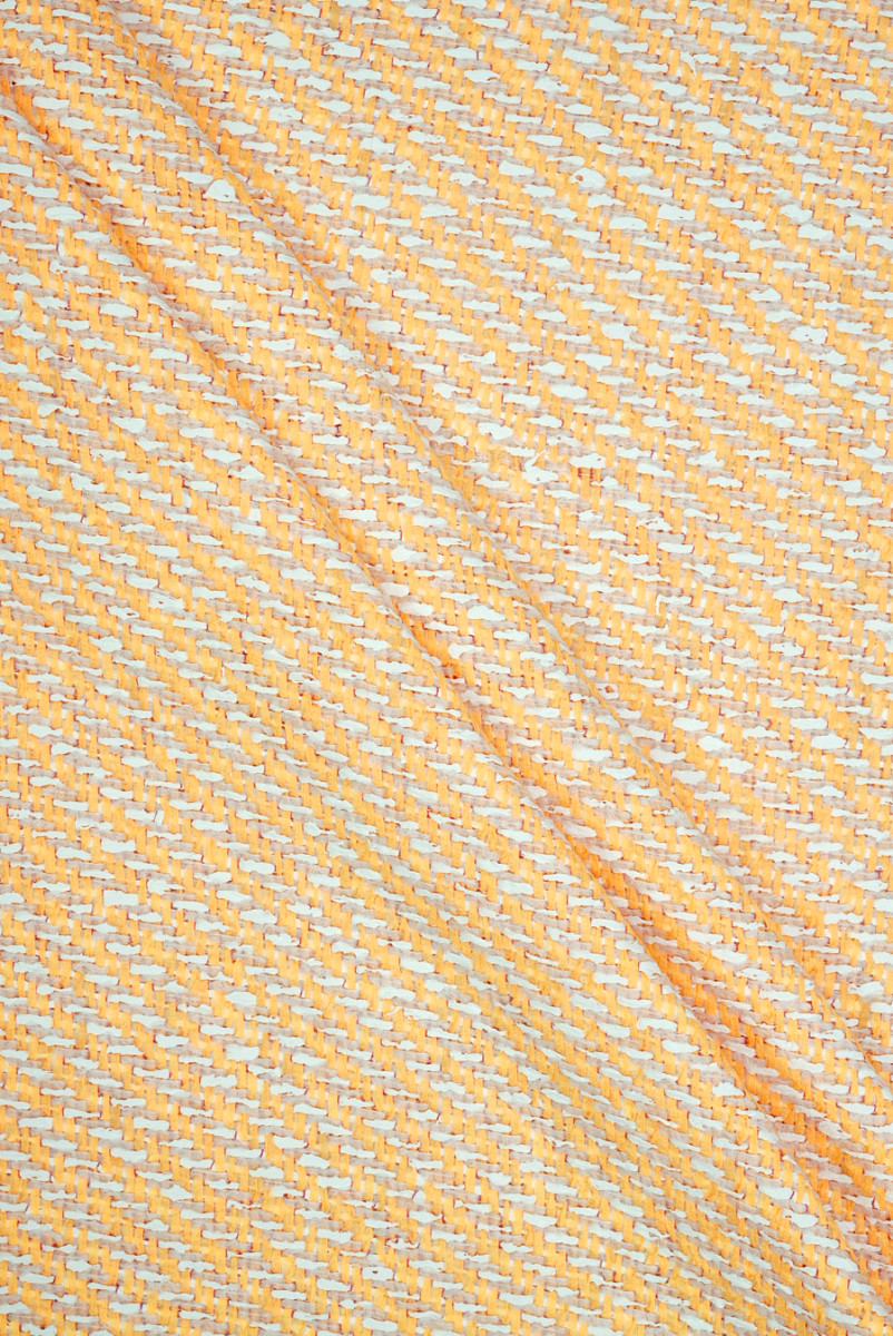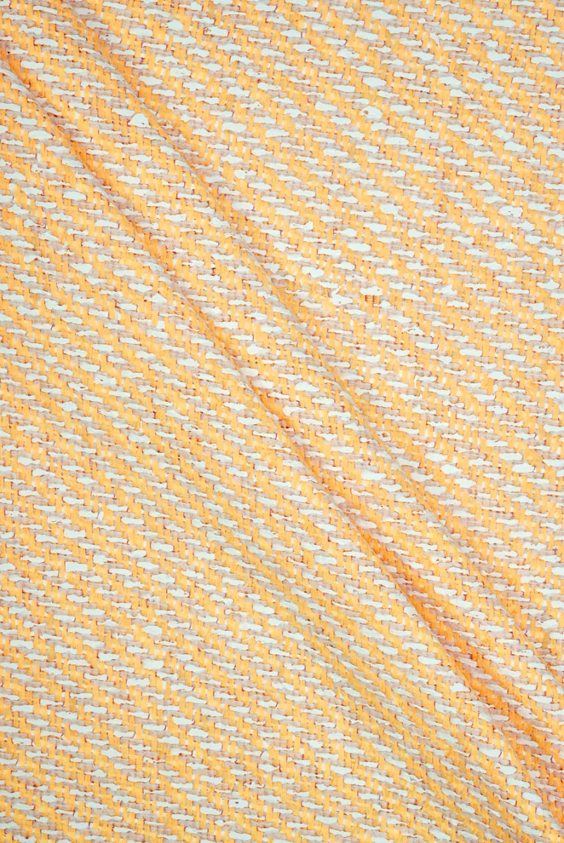 Mooie, klassieke Chanel-kostuumstof in lentegeel en wit, het geheel is gestikt met donkeroranje draad, dat bijna onzichtbaar is. De stof is zacht, niet-elastisch, vrij dun, vereist het gebruik van een voering, die in onze winkel kan worden geselecteerd. Het is perfect voor sets zoals: jas + rok, maar ook voor jurken.