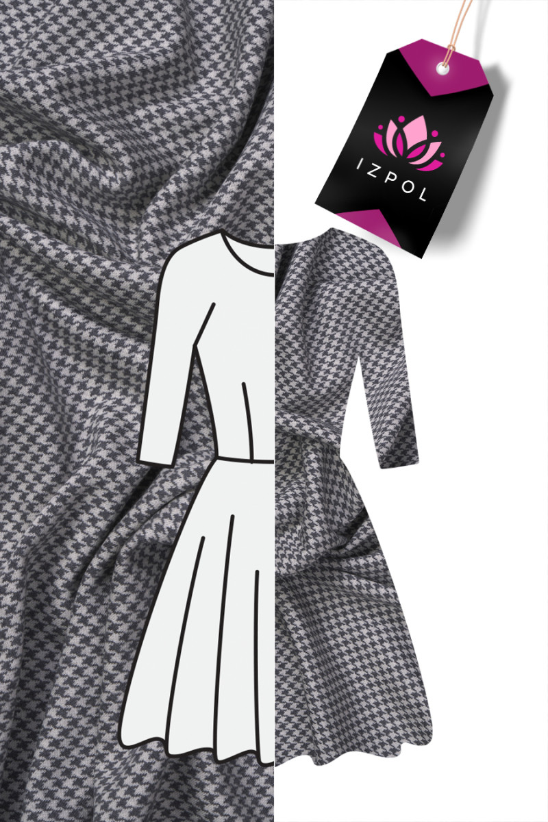Italiaanse jersey gebreide stof 100% wol met een grijs-crèmekleurig kippenpootmotief (0,5 cm). Jerseystof is een bedekkende, zacht gedrapeerde gebreide stof die ongevoerd kan worden genaaid. Het is geweldig voor alledaagse jurken, rokken, blazers, truien.