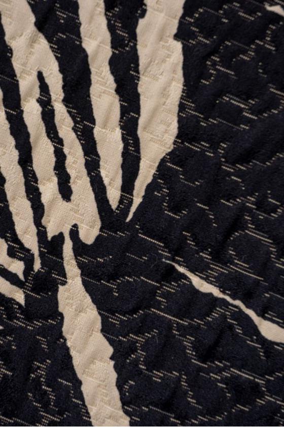 Italiaanse kostuumstof in zwart met een groot motief van exotische bladeren in beige. De stof is dun, voelt prettig aan met een duidelijk bolle, licht gekreukte (verfrommelde) structuur. Het is perfect voor het naaien van een interessante jurk, rok of als decoratieve stof.