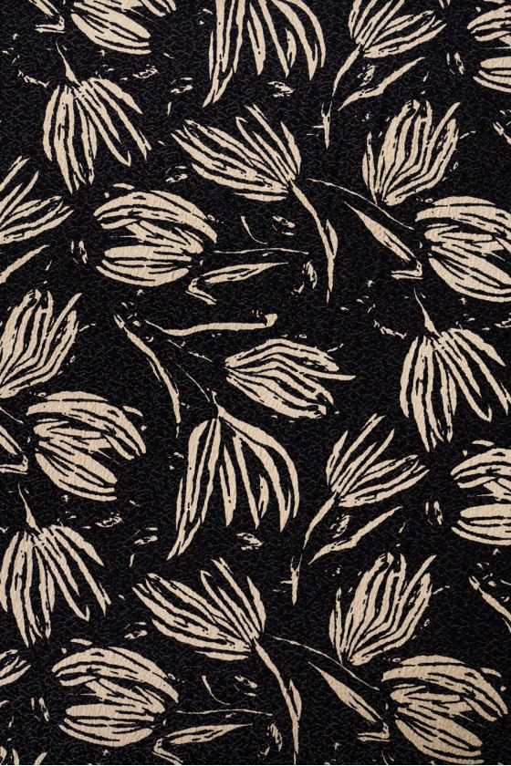 Italiaanse stof geweven in een lichte crêpe met een print van beige bladeren op een zwarte achtergrond.