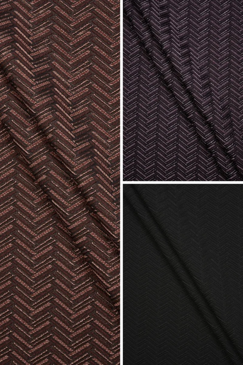 Italiaanse jacquardstof met visgraatmotief in drie kleuren - zwart, heideroze en bruin met koper. Het regelmatig in reliëf gemaakte patroon dat in lijnen is geplaatst, wordt om de 5 cm herhaald, versierd met een glanzende draad. De stof is middeldik, ondoorzichtig, zacht en elastisch. Het is perfect voor het naaien van een kostuum, jurk, rok, broek en een dunne jas.