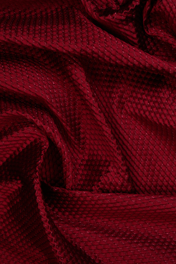 Italiaanse bordeauxrode jacquardstof met een fijn hexageenpatroon, bovendien versierd met glanzend garen. De stof is van gemiddelde dikte, niet-elastisch, met een duidelijke convexe structuur en zit stijf. Een fantastisch voorstel voor het naaien van een kostuum, jurk, rok of jas in de meest modieuze kleur van dit seizoen.