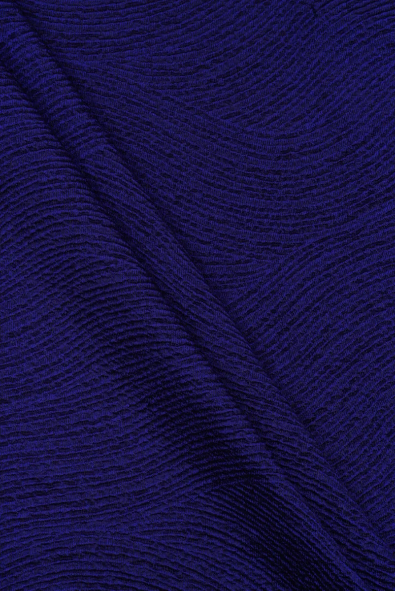 Polyester jacquardstof met een zeer dicht motief van dunne, lange golven in een intense korenbloemblauwe kleur. Het patroon is bol. De stof is niet-elastisch, dun, met een iets losse weving, waardoor hij niet helemaal ondoorzichtig is en vrij stijf valt. Een geweldig voorstel voor avondjurken, rokken of blouses.