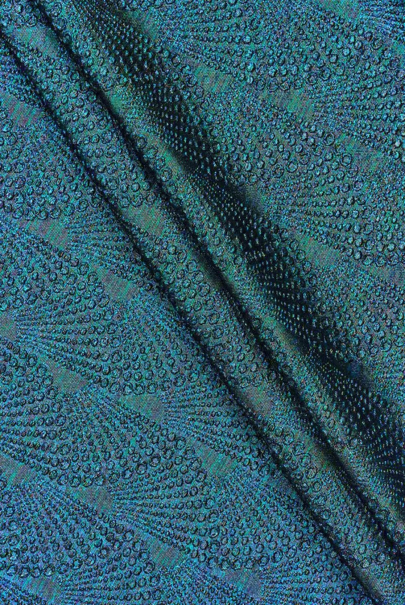 Jacquardstof met een motief van kleine, bolle stippen op een donkere zeegroene achtergrond. Regelmatige en zeer dicht op elkaar geplaatste bubbels in verschillende maten zijn gerangschikt in een patroon dat lijkt op helften van waaiers die elkaar raken en in lijnen zijn gerangschikt. De breedte van één strook is 8 cm. Het geheel is geweven met een veelkleurige draad die irriteert in groen, blauw en koper. De stof is van gemiddelde dikte, niet-elastisch, zacht en vrij licht. Een geweldige propositie voor formele outfits, zoals jurken, rokken, jassen of lichte jassen.