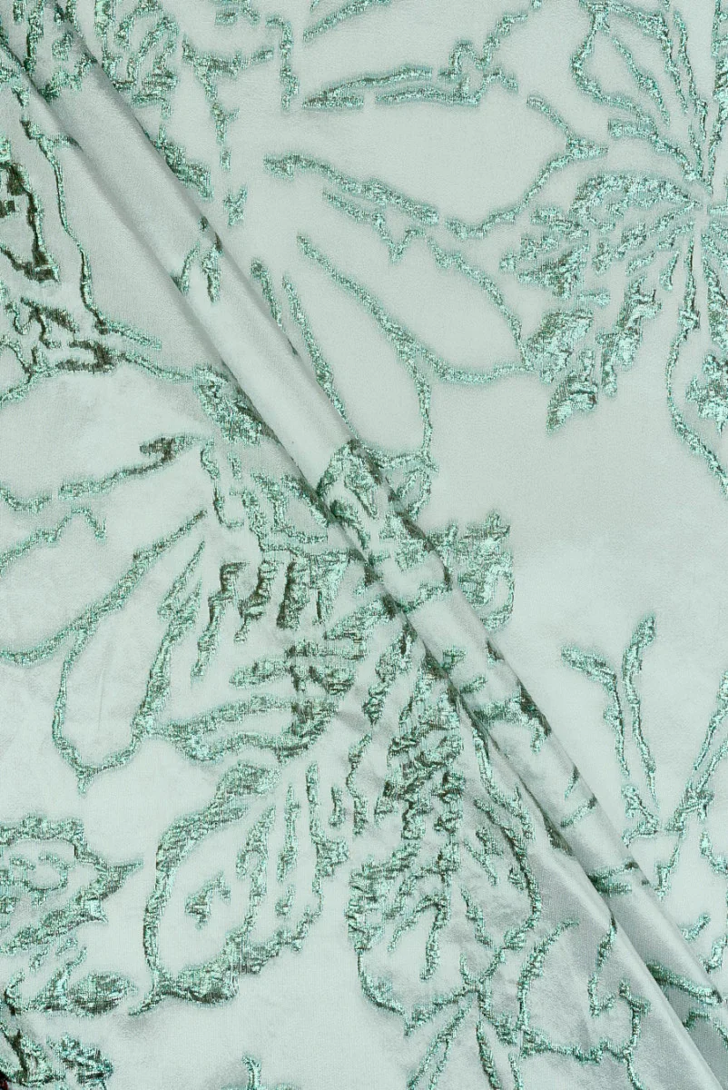 Jacquardstof met een motief van zeer grote bloemen geplaatst op een lichte muntkleurige achtergrond. De bloemmotieven zijn licht bol en geweven van glanzende draden in groen en lichtgoud, ze zijn vrij dicht op elkaar geplaatst en raken elkaar. De grootste bloem in grootte is 43 cm * 36 cm. De stof is dun maar ondoorzichtig, inelastisch, licht en vrij stijf, vereist voering en is afgewerkt met een mooie glans. Een zomers en fris voorstel voor avondoutfits, zoals jurken, rokken,