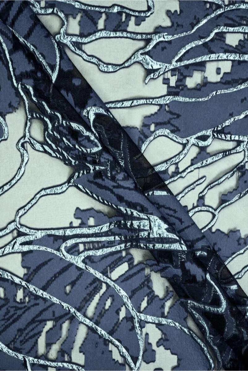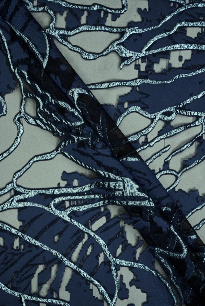 Jacquardstof met grote motieven in de kleur gedempt marineblauw geweven op organza-stof in zwart, die licht glanzend is. Het geheel is versierd met golfpatronen gemaakt van glinsterende blauwe draad. De stof is transparant op plaatsen zonder patroon, dun, inelastisch, licht stijf en wordt in een rustige kleurstelling gehouden. Een elegant voorstel voor avondjurken, rokken of blouses.