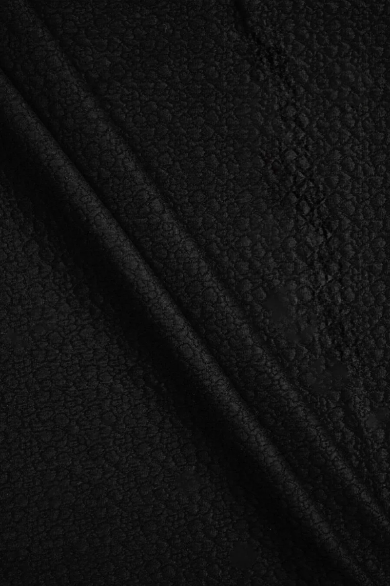 Italiaanse jacquardstof geweven van viscose en polyester in zwart met een bloemmotief. De stof bestaat uit twee lagen, die met zwarte draad zijn genaaid om bolle bloemen te vormen. Het patroon is zeer dicht en de bloemen zijn er in twee maten: de grootste is 2,5 cm, de kleinere is 1,5 cm. De stof is middeld, dekkend, elastisch en ligt zacht. Een interessant voorstel voor het naaien van een jurk, rok, kostuum en jas.