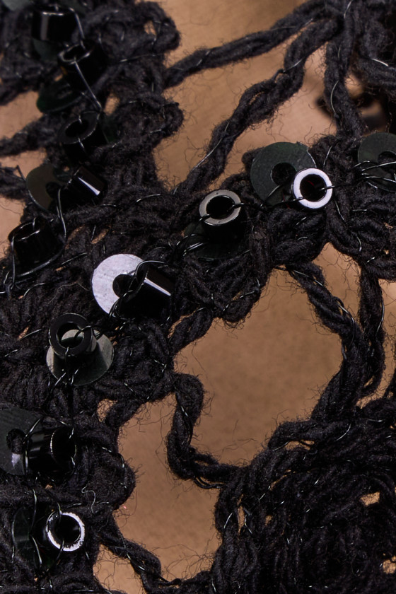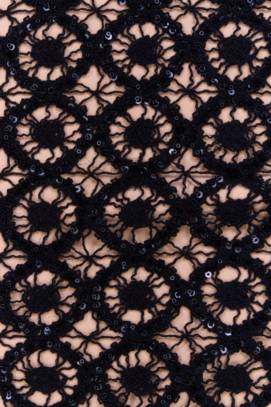 Italiaanse kant met een opengewerkt patroon in zwart versierd met zwarte kralen en pailletten. De stof is zacht, transparant, niet-elastisch en heeft een delicate glans dankzij de gebruikte kralen. Fantastisch kant, dat vele toepassingen heeft, kan worden gebruikt om jurken, blouses, rokken, tops op te roepen en ook voor afwerkingen.