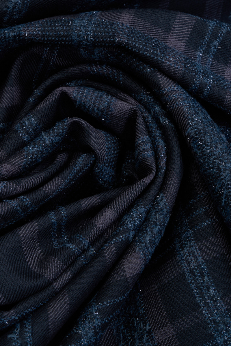 Italiaanse kostuumstof geweven van katoen en wol in donkergroen, groenblauw. Een klassiek geruit patroon in donkergrijs, dat is verrijkt met een glanzende draad in donkergroenblauw. De stof is zacht, lichtgewicht, niet-elastisch en sluit goed aan. Perfect voor het naaien van een kostuum, pak, broek, rok, jurk.