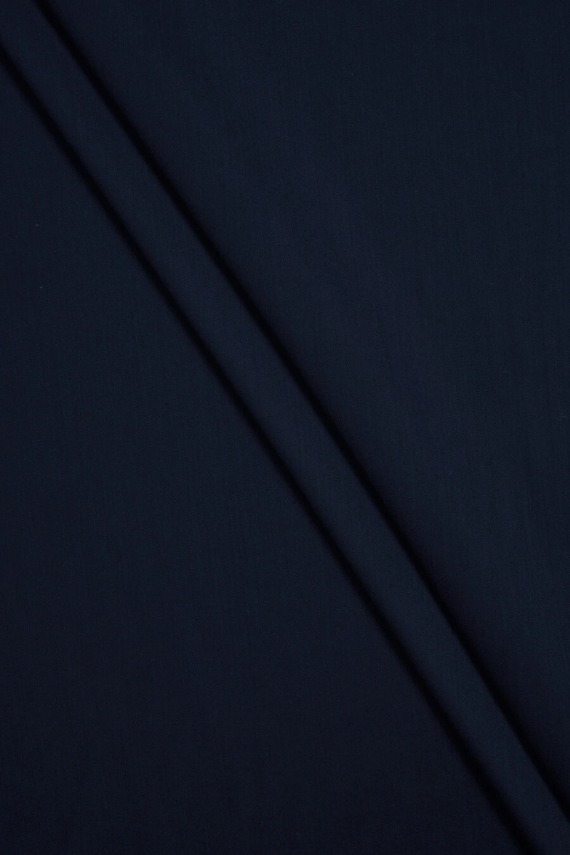 Italiaanse stof geweven van een mix van wol en polyamide met de toevoeging van elastaan in een zeer donkere marineblauwe kleur. De stof is dun maar ondoorzichtig, elastisch, zacht en afgewerkt met een delicate glans die het een elegante uitstraling geeft. Perfect voor klassieke kleding zoals jurken, rokken, broeken.