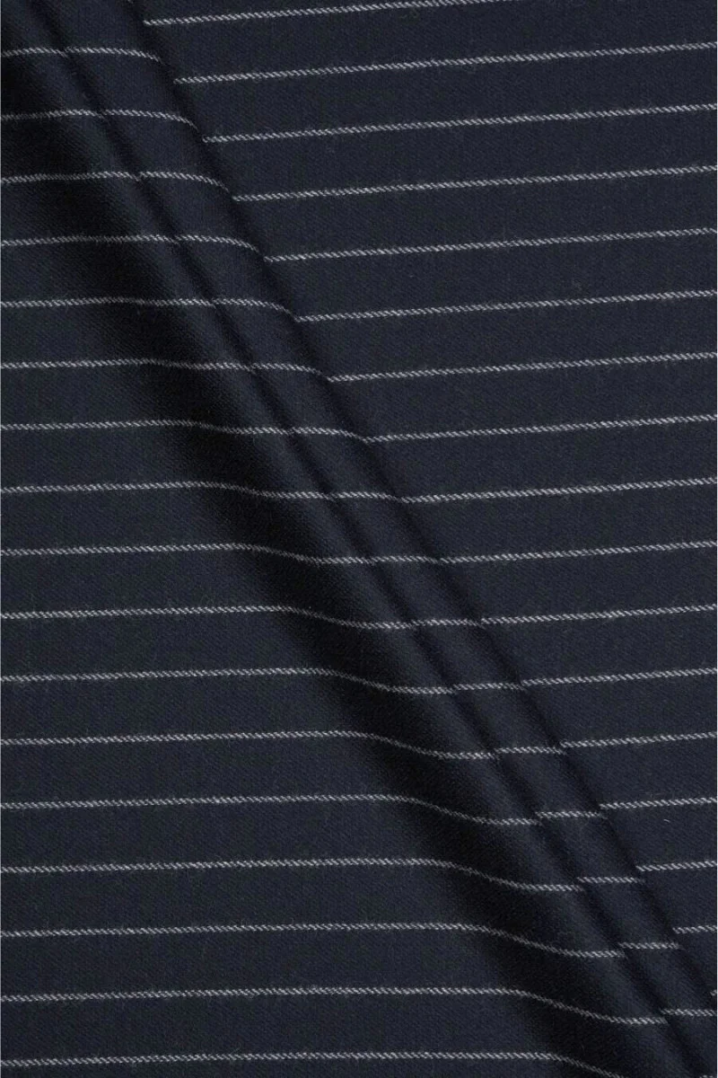 100% wollen stof in twee kleuren - zwart en zeer donker marineblauw met witte strepen. Het regelmatige patroon van strepen komt om de 2,5 cm voor en is opgebouwd uit kleine lijntjes. De stof is van gemiddelde dikte, zacht, niet-elastisch en mat. Een klassieker die perfect is voor warme winterkleding, zoals jassen, broeken, vesten en jurken.