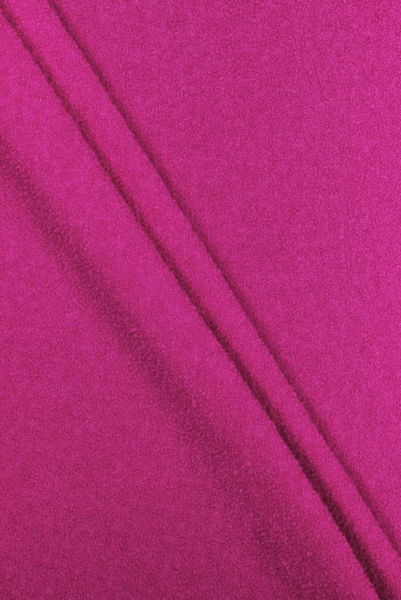 Italiaanse wollen stof met de toevoeging van polyamide in de vorm van een delicate bucle in rood en fuchsia. De stof is van gemiddelde dikte, niet-elastisch, mat, met een duidelijk waarneembare structuur. Een voorstel dat perfect is voor lichte jassen, jassen, jassen en rokken.