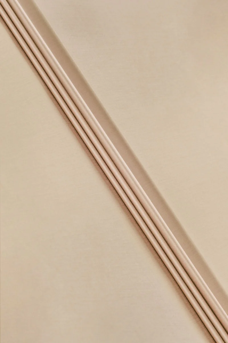 Italiaanse superkostuumwol in licht beige. Vlezig, elastisch materiaal met een fijn satijnweefsel (licht glanzend) gemaakt van vergenwol (vergewol komt van het eerste scheren van schapen, dus het is erg delicaat en zacht).