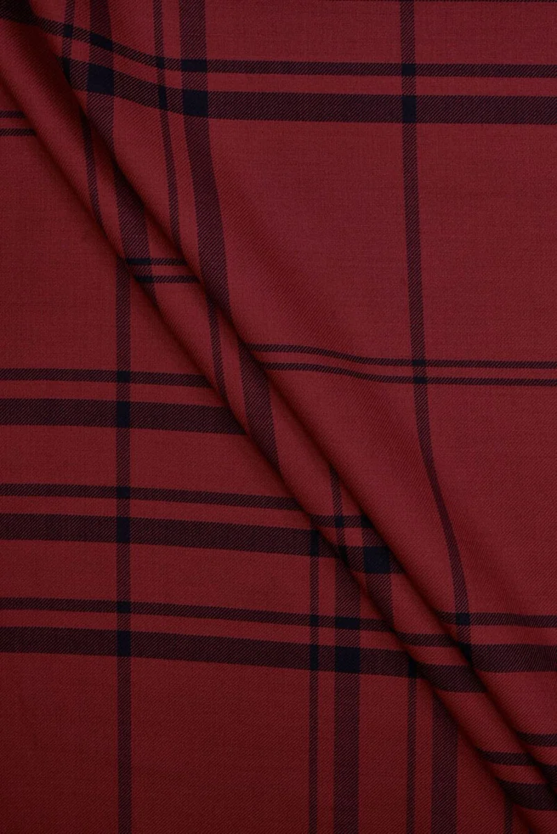 Italiaanse wolstof in donkerrood met een groot zwart geruitpatroon. Een enkel motief is 11,5 cm breed en 13,5 cm hoog. De stof is vlezig, vrij dik, zacht, elastisch en dubbelzijdig - de linkerkant is patroonloos in donkerrood. Het materiaal heeft een keperweefsel. De stof werkt goed bij het naaien van een jasje, jurk, broek of vest. Een geweldige optie voor mensen die op zoek zijn naar unieke materialen.