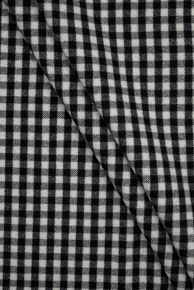 Italiaanse 100% wollen stof met een zwart-crème geruite motief. Regelmatig gelegd patroon van vierkanten van 1 cm*1 cm groot. De stof is van het wintertype. Hij is onbuigzaam, mat, vrij stijf en een beetje ruw in de grip. We raden het aan voor jassen, rokken en overgangsbovenkleding, bijvoorbeeld een jas.