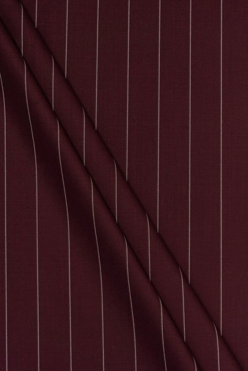 Italiaanse bordeauxrode stof geweven van 100% maagdelijke wol met een motief van regelmatige lichte strepen. De strepen zijn dun, 1 mm breed, langs de lijn en elke 3 cm herhaald. De stof is vrij dun, niet elastisch, afgewerkt met een zeer subtiele glans en zit prachtig. Hoogwaardige materialen bedoeld voor kostuums, pakken, evenals rokken en jurken.
