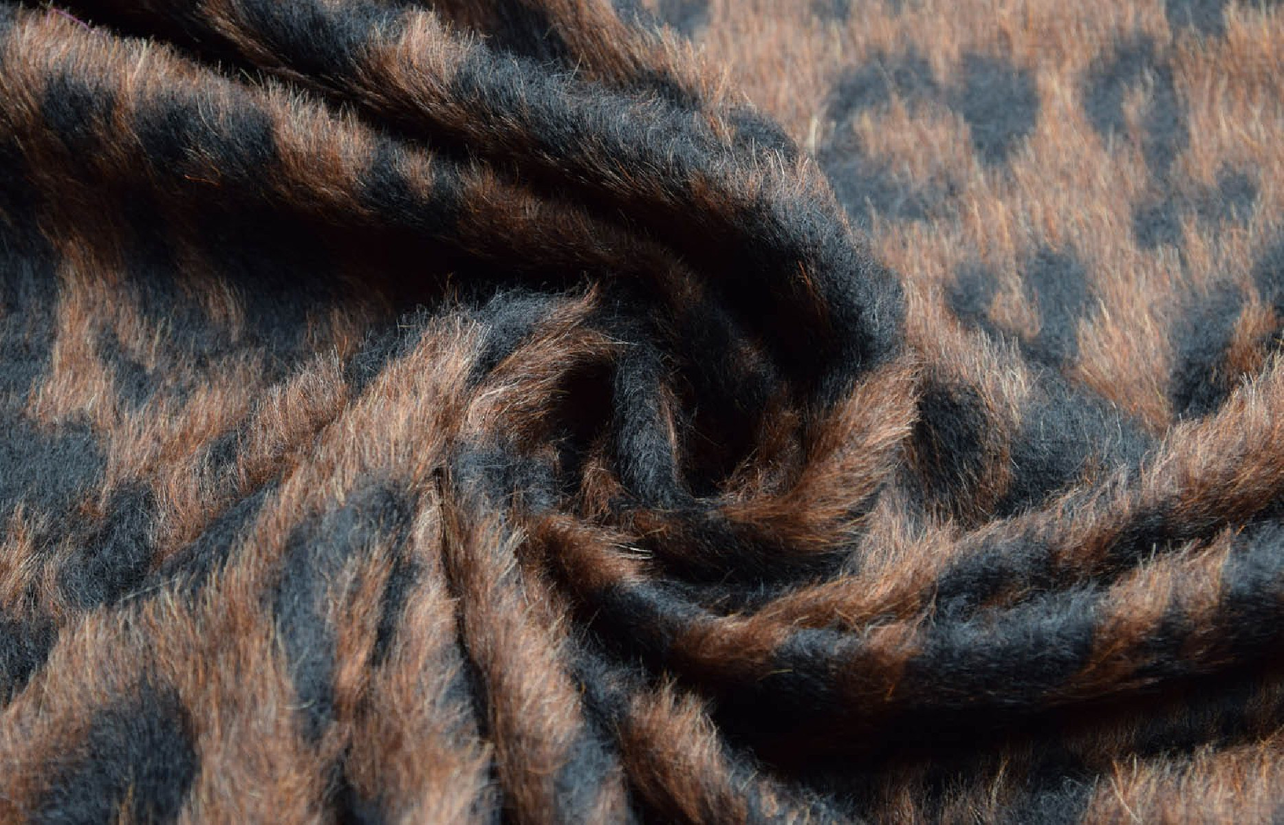 Italiaanse jasstof in lichtbruin met een zwart luipaardprint motief, de stof heeft kort haar.