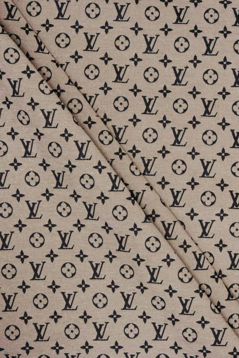 Italiaanse katoenen stof met toevoeging van polyamide in beige met een geborduurd motief van letters en postzegels. Het patroon is regulier, in zwart gemaakt en toont de symbolen van een bekend, wereldwijd modemerk. Het motief van twee letters heeft een grootte van 1,7 cm * 2 cm. De stof is vlezig, onelastiek, mat en nogal stijf, wat doet denken aan denim. Het is perfect om een jasje, katanajasje, broek en jurk te naaien.