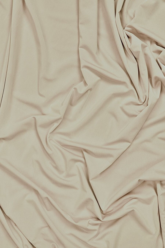 Italiaanse viscose gebreide stof in twee kleuren: beige en donker marineblauw. Een gebreide stof met een glad weefsel, elastisch, vloeiend, koel aanvoelend en ondoorzichtig. Het is perfect voor zomerkleding, dankzij het aangename, koele effect bij het aanraken van de huid. We raden het aan voor jurken, rokken, blouses. De gebreide stof kan worden gebruikt voor getailleerde snitten en lossere, vloeiende snitten.