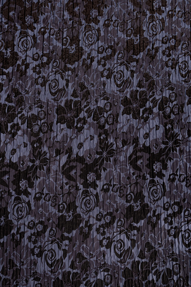 Italiaanse jacquard kostuumstof in gedempt paars met een motief van bruine bloemen. Een dunne, zachte stof met een zeer interessante, gegolfde textuur.
