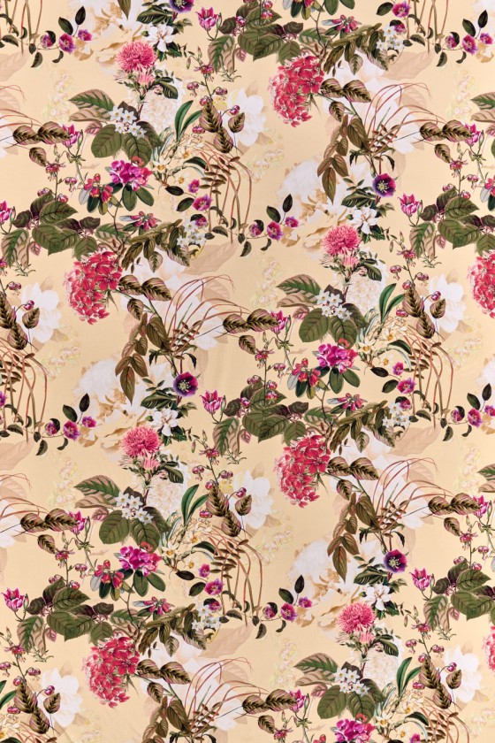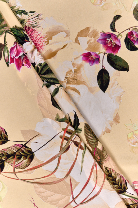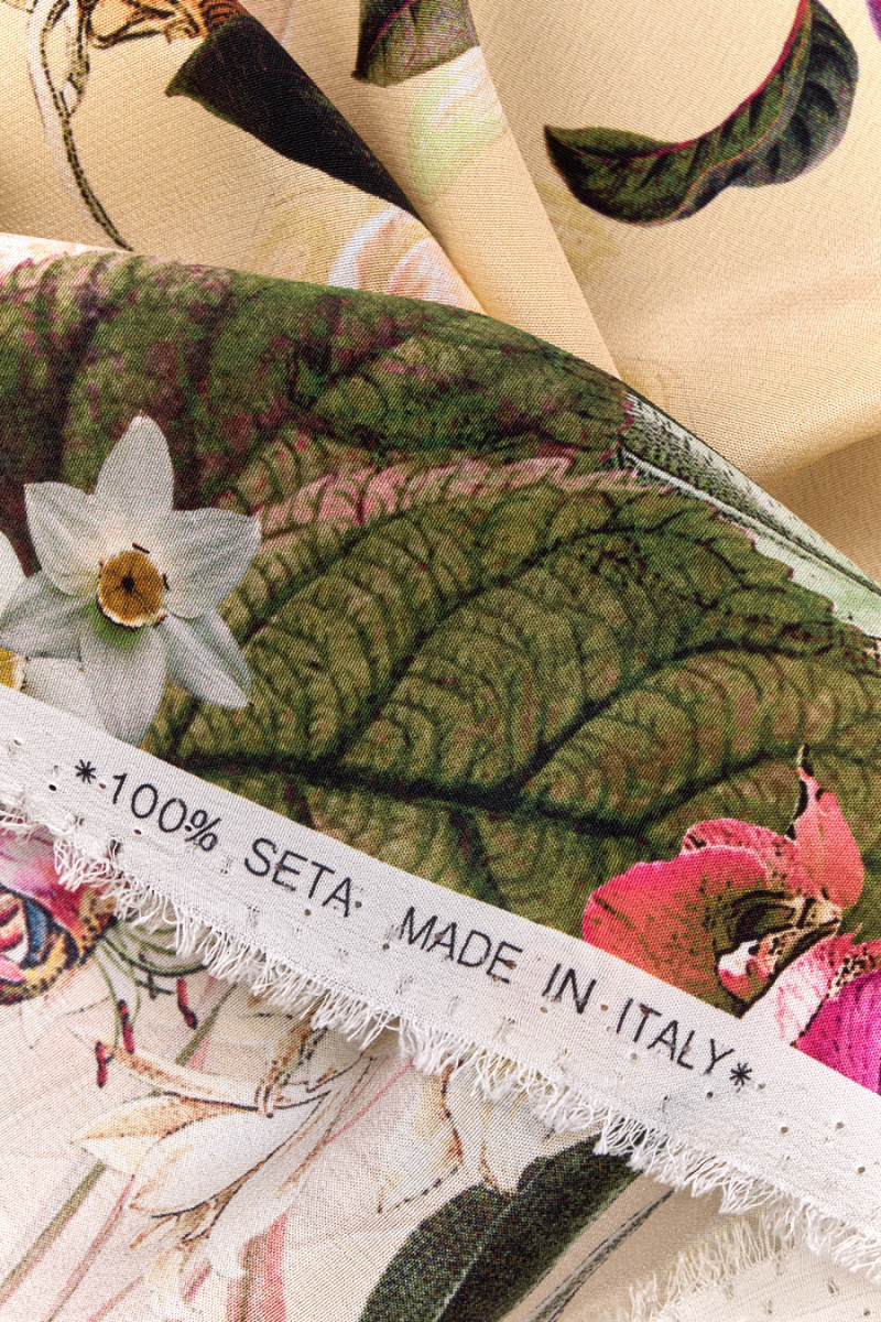 Italiaanse crêpe van 100% zijde met een bloemmotief op een lichte banaanachtergrond. Grote patronen van verschillende soorten bloemen en bladeren. De stof is zeer licht, luchtig, niet-elastisch, afgewerkt met een zeer delicate glans. Een uniek voorstel dat perfect is voor het naaien van een blouse, overhemd, jurk of tuniek.