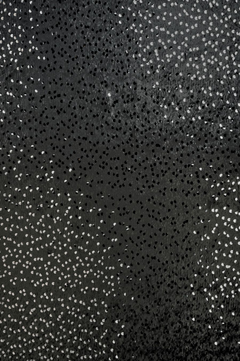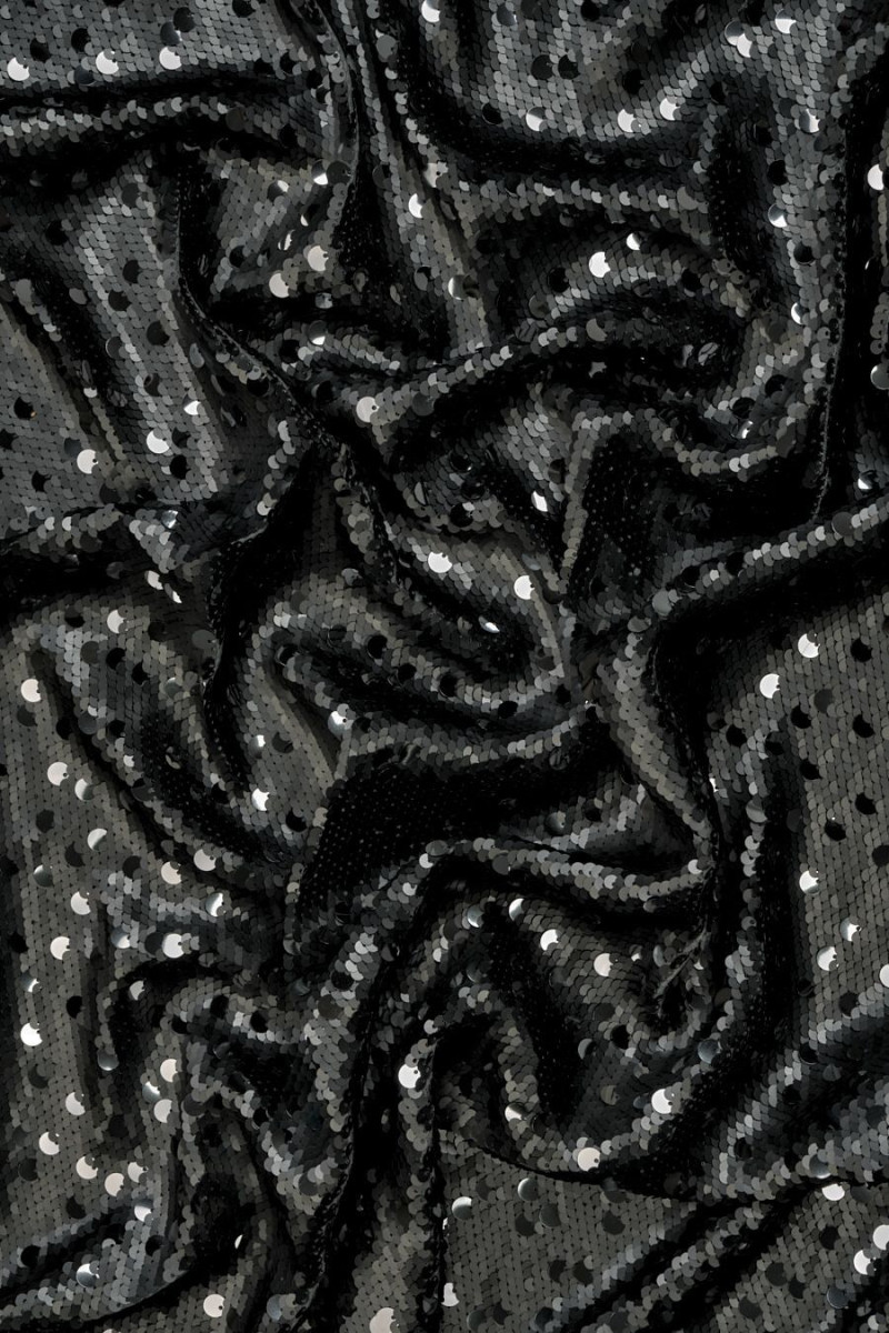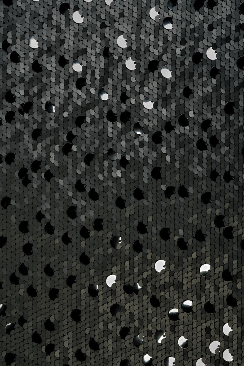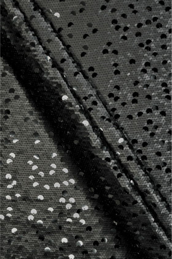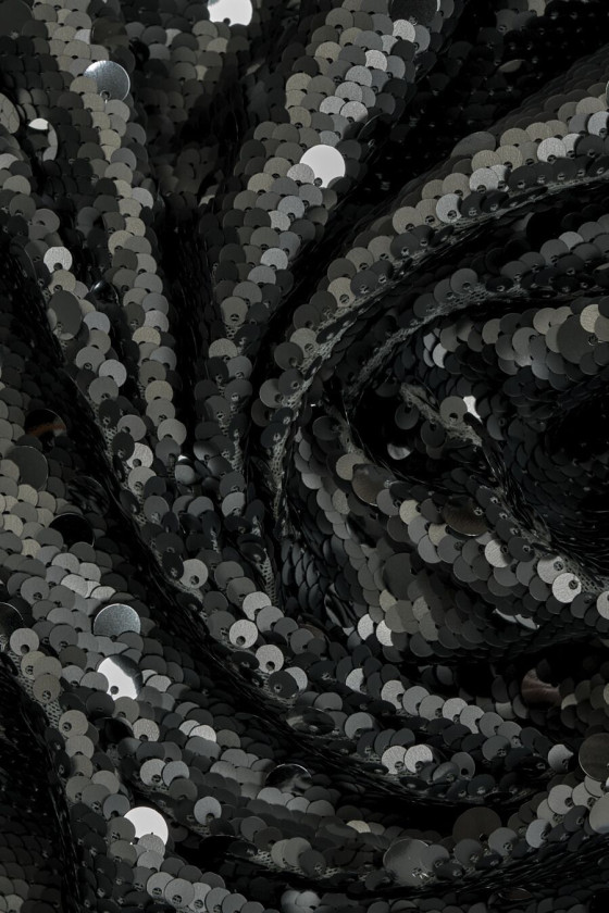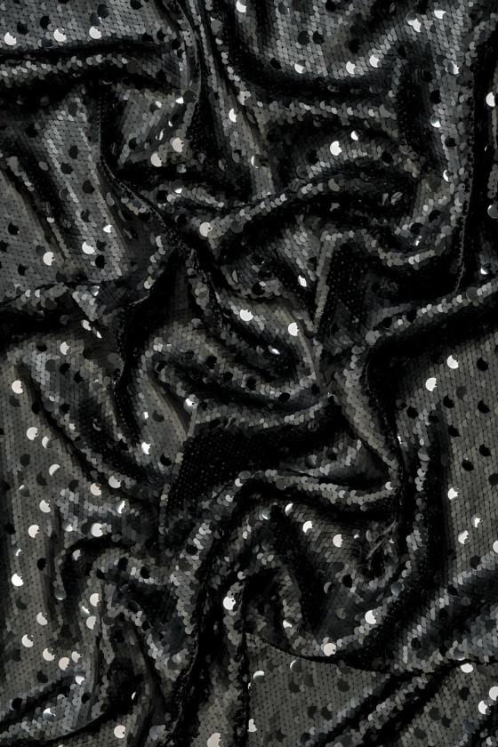 Opvallende paillettenstof in verschillende kleuren. Twee soorten pailletten dicht gerangschikt op een elastisch gaas. De basis bestaat uit kleinere matte pailletten, waartussen grotere en glanzende pailletten onregelmatig zijn genaaid. De stof is elastisch, vloeiend, ondoorzichtig, vrij zwaar, om rondom te naaien vanwege de richting waarin de pailletten zijn genaaid. Het net is 160 cm breed en de pailletten staan 140 cm uit elkaar. Een tijdloze propositie waaruit je jurken, rokken, blouses of tops kunt maken.
