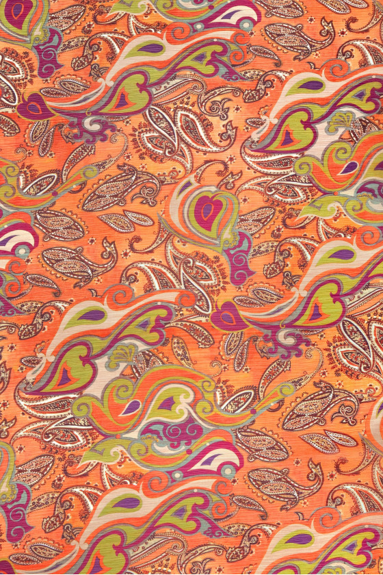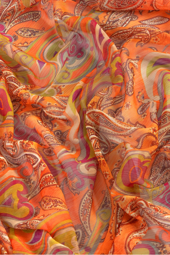 Italiaanse polyester chiffon (gekreukt) met een oosters motief in rode en oranje kleuren. Gekreukte chiffon is een zeer delicate, luchtige, transparante stof met een licht "gekreukte" structuur.