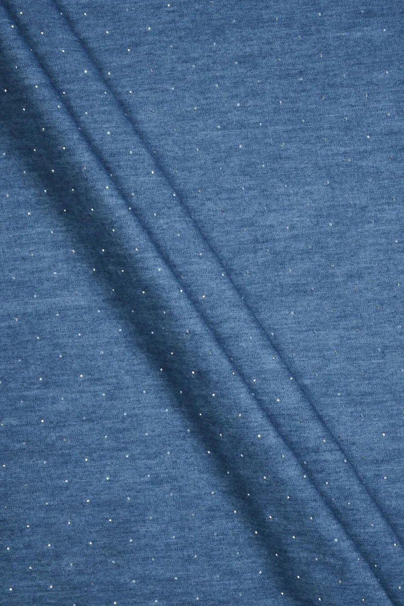 Italiaanse denim stof in blauw. De stof is versierd met piepkleine zilveren zirkonia, die regelmatig elke 2,5 cm worden geplaatst. Het materiaal is vrij dun maar dekkend, zacht, onflexibel en lichtgewicht. Een klassiek voorstel waarmee je jurken, rokken, blouses en overhemden kunt naaien.