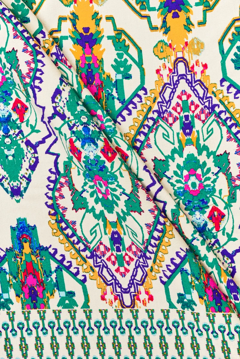 Italiaanse stof van 100% viscose met dichte, kleurrijke etnische motieven op een lichtbeige achtergrond. Regelmatig worden er vrij grote patronen gelegd, één repeterend element is 50 cm lang en 16 cm breed. Beide randen van de stof zijn afgewerkt met verschillende randen, de ene met een breedte van 32 cm heeft twee soorten patronen gescheiden door een oranje streep, terwijl de andere een patroon in groen heeft en 16 cm breed is - we raden aan om rondom te naaien. De stof is vloeiend, vrij bedekkend, niet-elastisch, gemaakt van een delicate georgette-weving en heeft een mooie zwaarte waardoor het materiaal vloeiend is. We raden de stof vooral aan voor zomerkleding, zoals blouses, jurken, korte broeken of broeken.