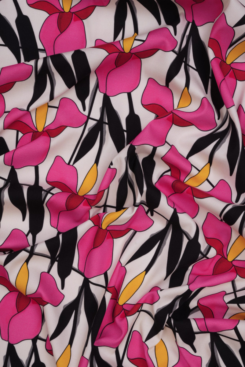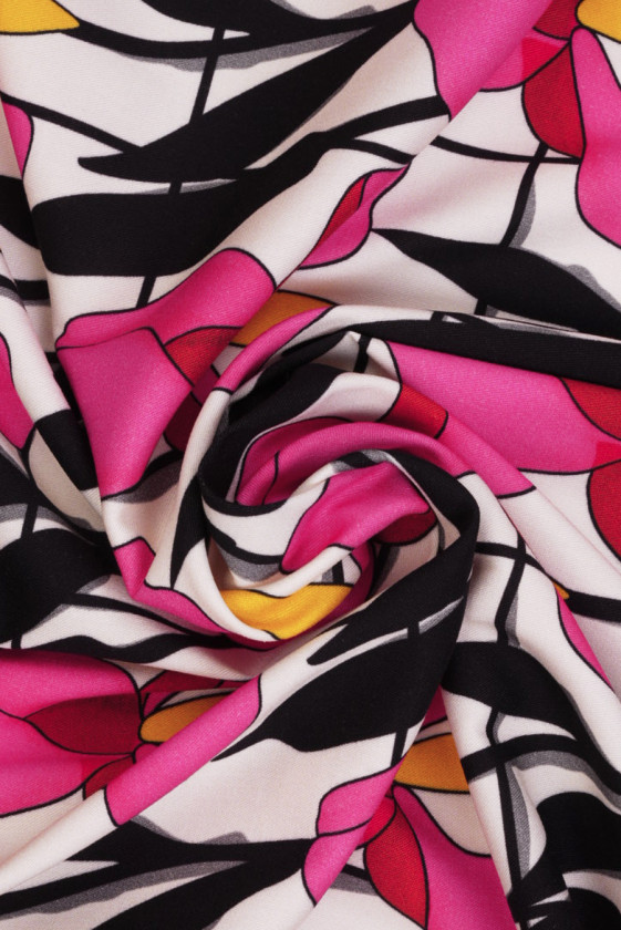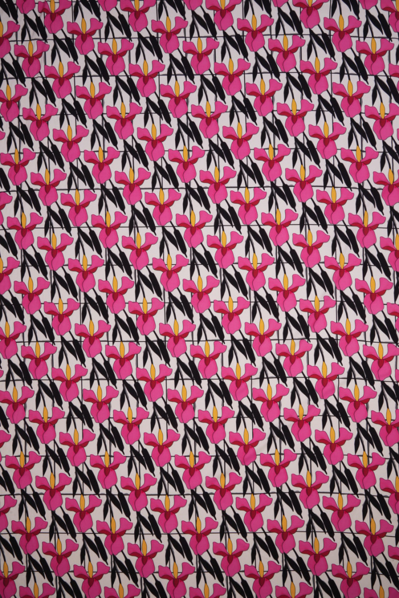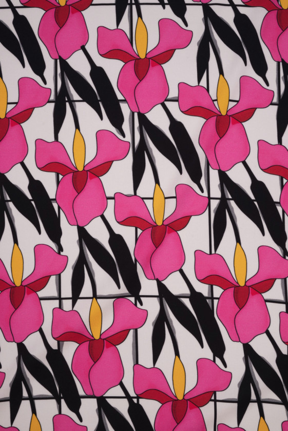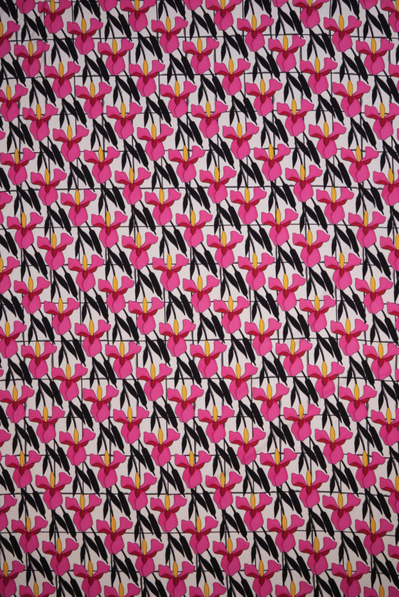 Italiaanse viscose stof met de toevoeging van elastaan met een bloemenmotief. Het patroon is erg dicht en wordt gevormd door roze irissen omgeven door zwarte bladeren. Het geheel is gedrukt op een crèmekleurige achtergrond met een groot zwart ruitpatroon. De stof is goed dekkend, zeer elastisch en vloeiend. Het kan in veel kledingprojecten worden gebruikt, omdat het perfect is voor blouses, overhemden, jurken, rokken, kimono's, maar ook voor lossere broeken of korte broeken.
