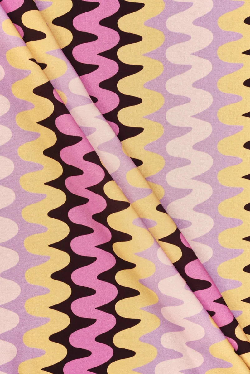 Italiaanse stof van 100% viscose met een geometrisch motief dat lijkt op zigzaglijnen. Het patroon is dicht en horizontaal gerangschikt in de volgende kleuren: geel, paars en bruin. De stof is dun maar goed bedekt, inelastisch, licht en vloeiend. Het kan in veel kledingprojecten worden gebruikt, omdat het perfect is voor blouses, overhemden, jurken, rokken, kimono's, maar ook voor lossere broeken of korte broeken.