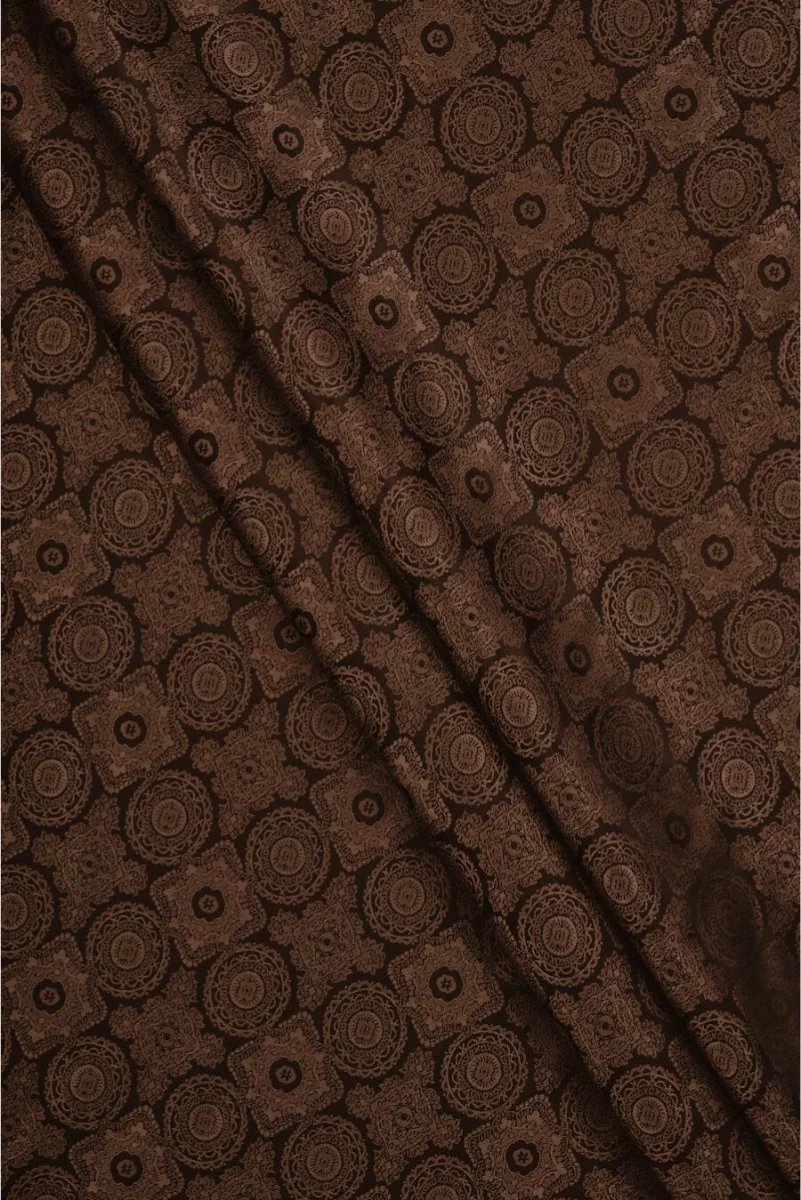 Italiaanse jacquardvoering met een dicht, oosters motief geweven van twee kleuren draden - bruin en donkerbruin om een tweekleurige kleur te creëren. Niet-elastische stof, licht glanzend. Ideaal voor het voeren van jassen, jassen, vesten, jassen.