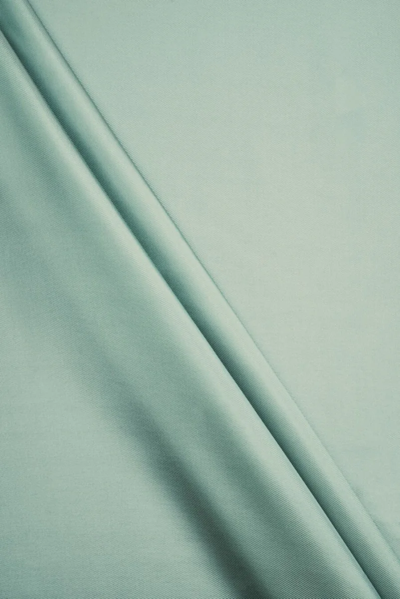 Italiaanse voering geweven van 100% acetat met een keperbinding in muntkleur. De stof bestaat uit twee garenkleuren: blauw en lichtgroen, wat een tweekleurig effect creëert. Het materiaal is niet-elastisch van middelmatige dikte en heeft een glanzende afwerking. Het is perfect om een jasje, rok, jas of jasje te voeren.