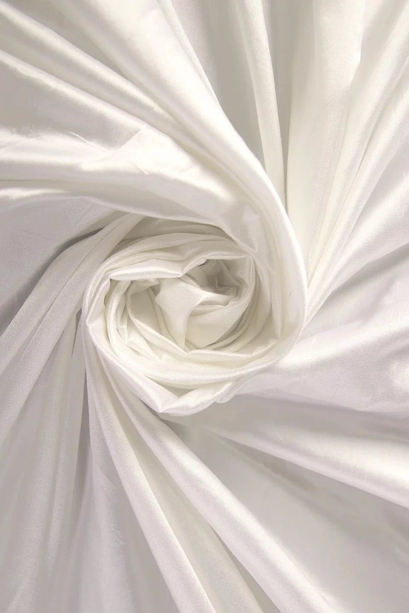 Italiaanse 100% shantonzijde stof in crèmekleur. De stof is gladder met lichte verdikkingen. Het is dun, onbuigzaam, vrij stijf en heeft een glanzende afwerking, waardoor het er erg elegant uitziet. Het is perfect voor avondjurken, rokken, blouses en jasjes.