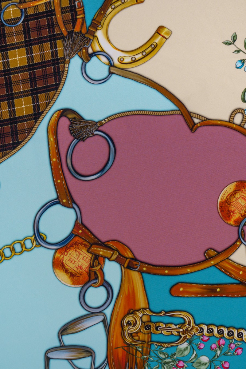 Italiaanse crêpe van 100% zijde met interessante motieven van paardenzadels en stijgbeugels - kenmerkend voor het bekende modehuis. Kleuren: blauw, blauw, bruin, beige, vuilroze.