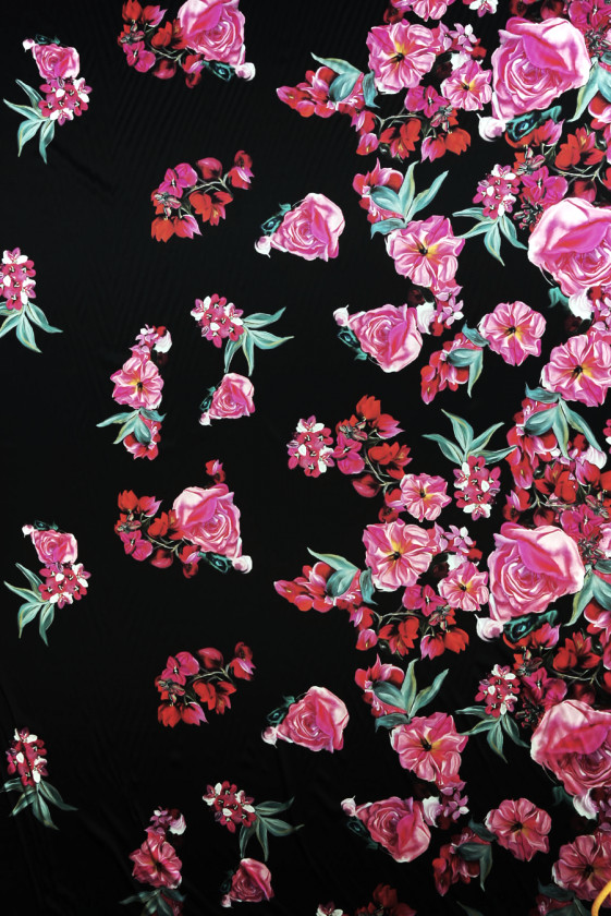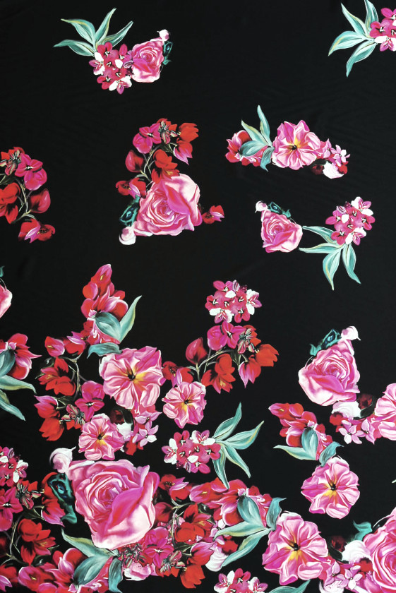 Italiaans zijdesatijn met de toevoeging van elastaan met een motief van grote bloemen in de kleuren frambozenrood en donkerroze op een zwarte achtergrond. Een bloemmotief dicht op elkaar gelegen langs de ene rand en minder vaak in het midden en aan de andere kant - we raden aan om rondom te naaien. Een enkele bloem is 15 cm * 15 cm groot. De stof is elastisch, vloeiend, voelt delicaat aan, zacht en ondoorzichtig. Een unieke stof waaruit je jurken kunt toveren voor verschillende feesten, maar ook elegante rokken, blouses of tunieken.