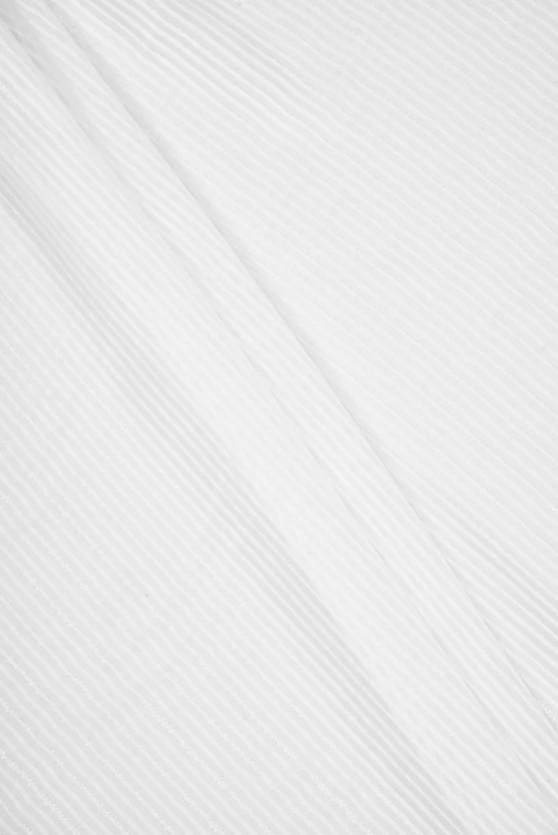 Italiaanse devore zijden stof met een motief van smalle strepen, verticaal gerangschikt in wit. Chiffon strepen zijn 0,3 cm breed en satijnen bandjes 0,2 cm breed, daarnaast is de stof versierd met zilveren, glanzende lurex draad. De stof is dun, licht transparant, vloeiend, licht en onbuigzaam. Het is perfect voor het naaien van een jurk, blouse, overhemd of rok.