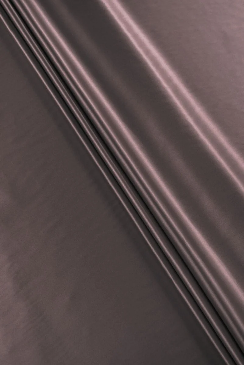 Italiaanse satijn 100% zijde in grijsbruin met een druppel paars. Niet-elastische stof met een hogere grammage.